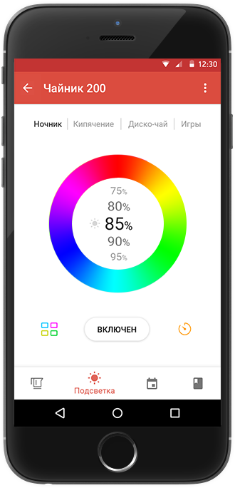 Одним прикосновением к экрану смартфона можно включить подсветку инновационного чайника SkyKettle, выбрав любой цвет и при желании настроив его яркость.